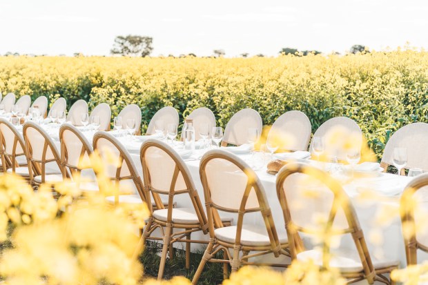 Set among a blooming canola crop at it’s peak beauty in Spring, this 24 metre table was set for 80 guests right in the middle of the crop. The winding track into the table made for an inquisitive walk through the canola, where the table was an astonishing surprise surrounded by the vibrant yellow blooms.