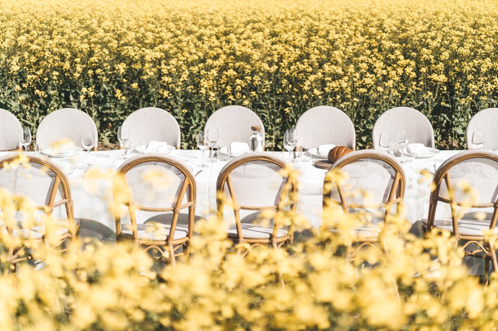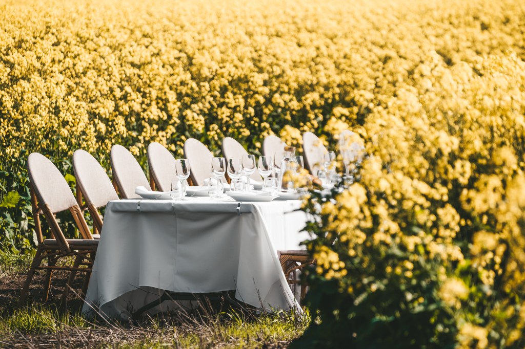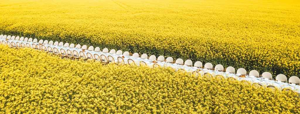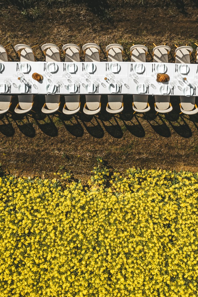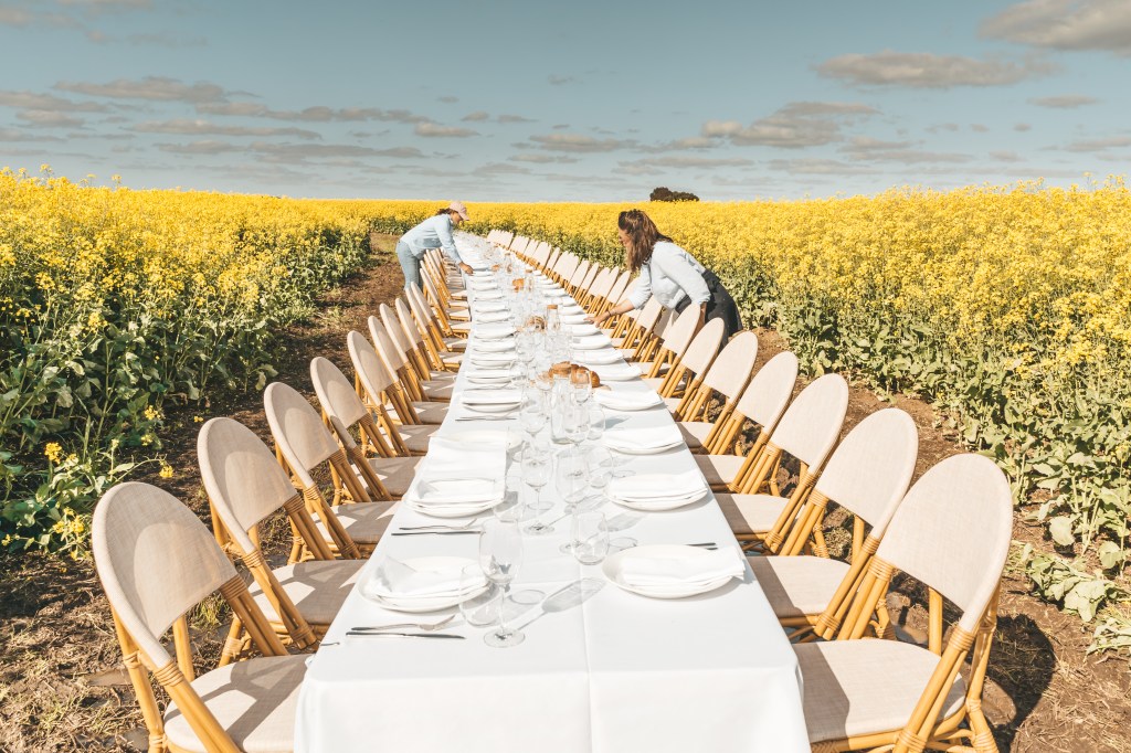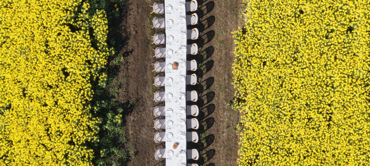 Set among a blooming canola crop at it’s peak beauty in Spring, this 24 metre table was set for 80 guests right in the middle of the crop. The winding track into the table made for an inquisitive walk through the canola, where the table was an astonishing surprise surrounded by the vibrant yellow blooms.