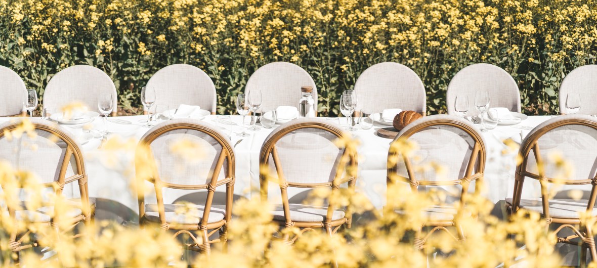 Set among a blooming canola crop at it’s peak beauty in Spring, this 24 metre table was set for 80 guests right in the middle of the crop. The winding track into the table made for an inquisitive walk through the canola, where the table was an astonishing surprise surrounded by the vibrant yellow blooms.